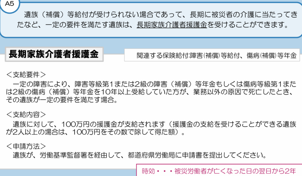 遺族補償年金は、労働者が業務上または通勤による災害で死亡した場 合、死亡当時にその収入によって生計を維持していた遺族に対して支給される労災保険の年金です(死亡日の翌日から5年以内)。